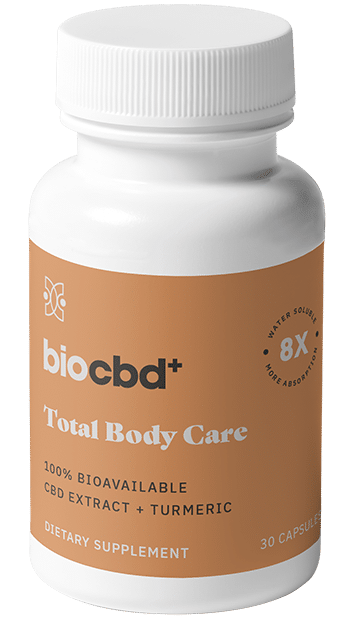 A bottle of BioCBD Plus Total Body Care contains 30 ten-gram capsules. The brand markets this product as water-soluble capsules for easy absorption.