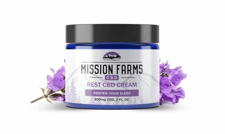 A 2-fluid oz jar of Mission Farms Rest CBD Cream is filled with 300mg of full-spectrum CBD. It is formulated with chamomile and lavender essential oils to promote relaxation and better sleep.