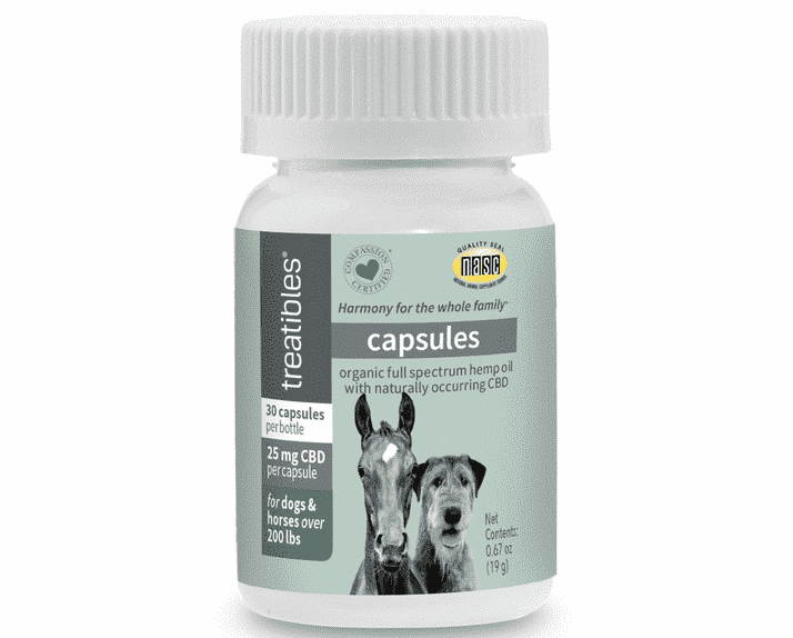 Treatibles’ full-spectrum hemp oil capsules are available in three variants: 25mg for dogs and horses, 10mg for dogs, and 25mg for people.